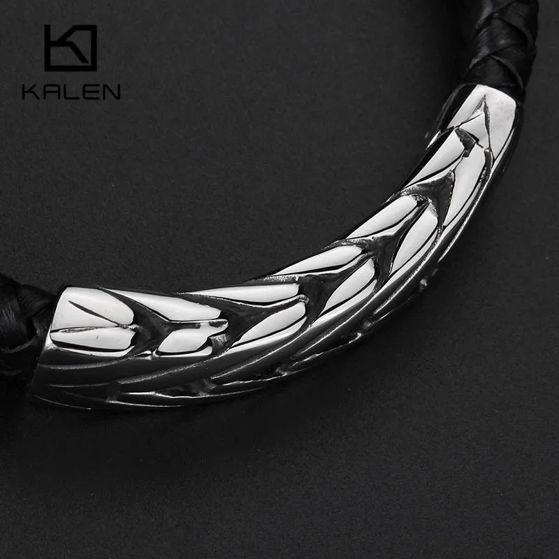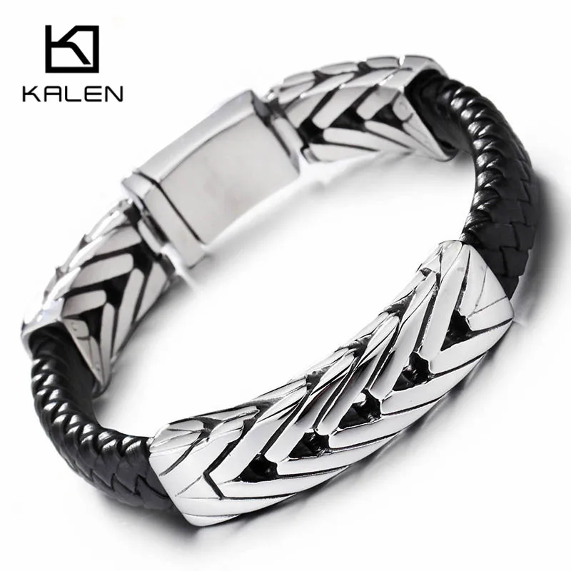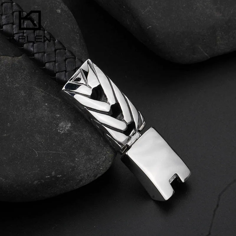 22cm Fashion Braided Leather Bracelet Men Stainless Steel High Polished Vintage Charm Bangle Male J